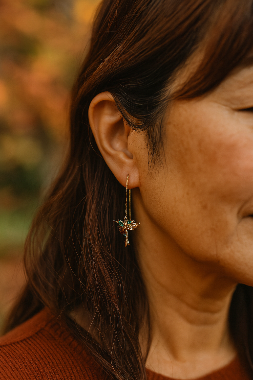 光を受けて揺れるハチドリのように、あなたの心も自由に輝きます。今、この幸運のピアスをあなたのものに。