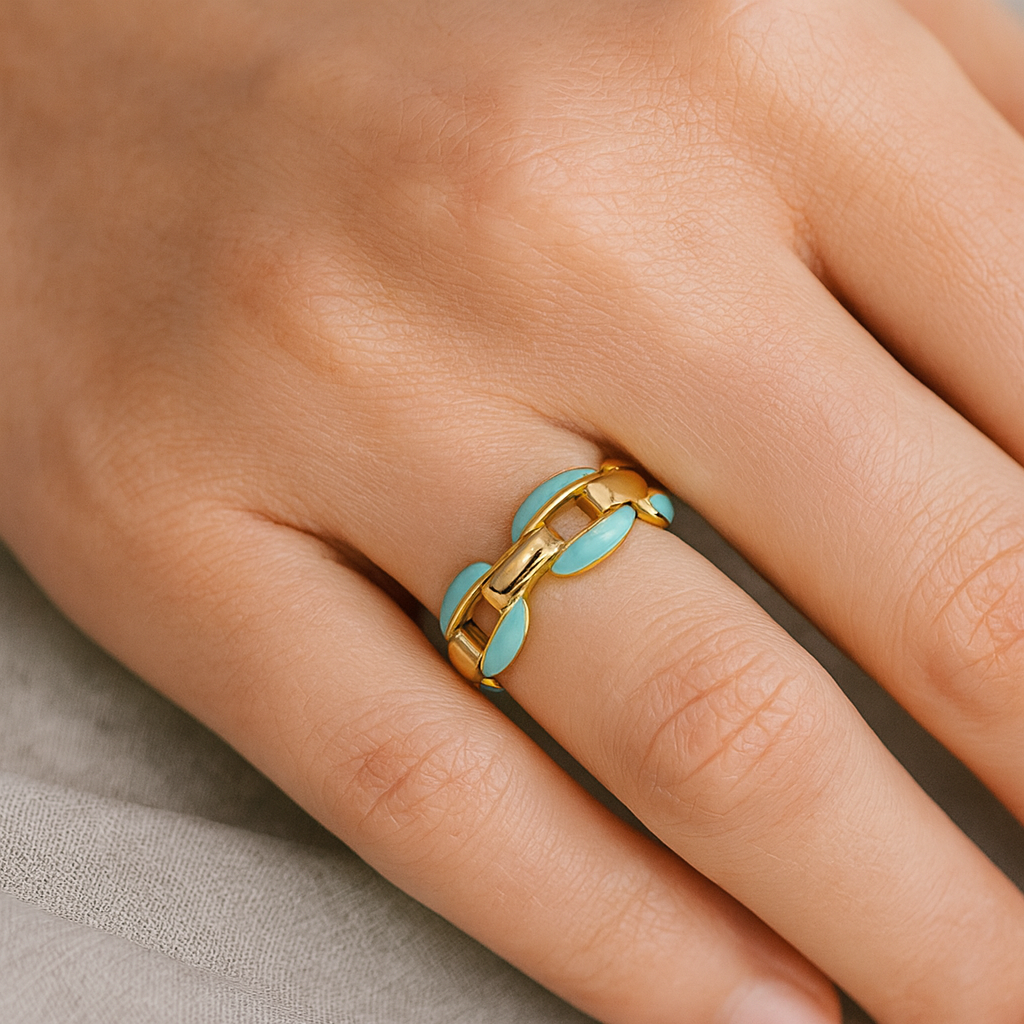 ブルー レイヤ チェーン リング」は、自由と輝きを象徴するモダンなデザイン。繊細なチェーンとクールなブルーストーンが絶妙に調和し、指先に都会的な洗練さを添えます。どんなスタイルにも自然に溶け込み、さりげなく個性を際立たせるリングです。