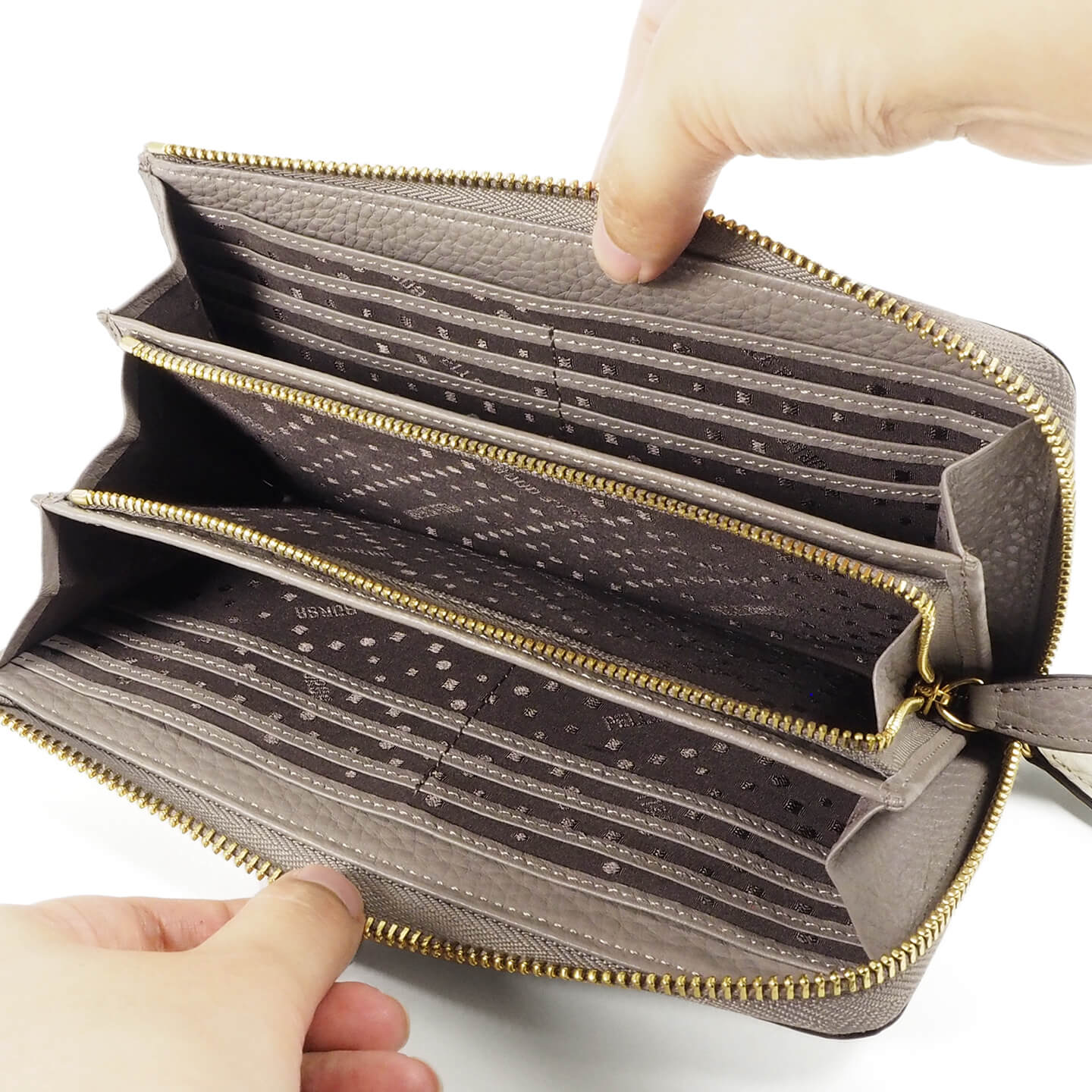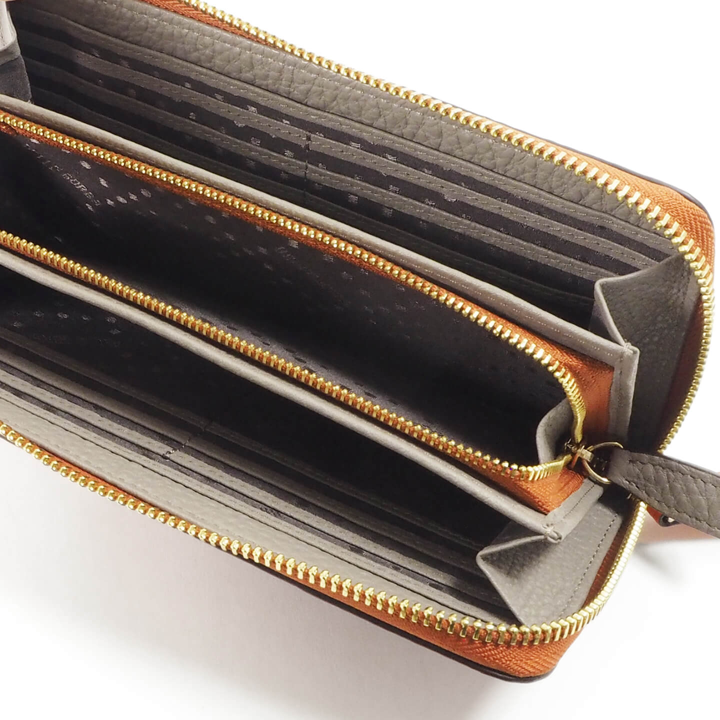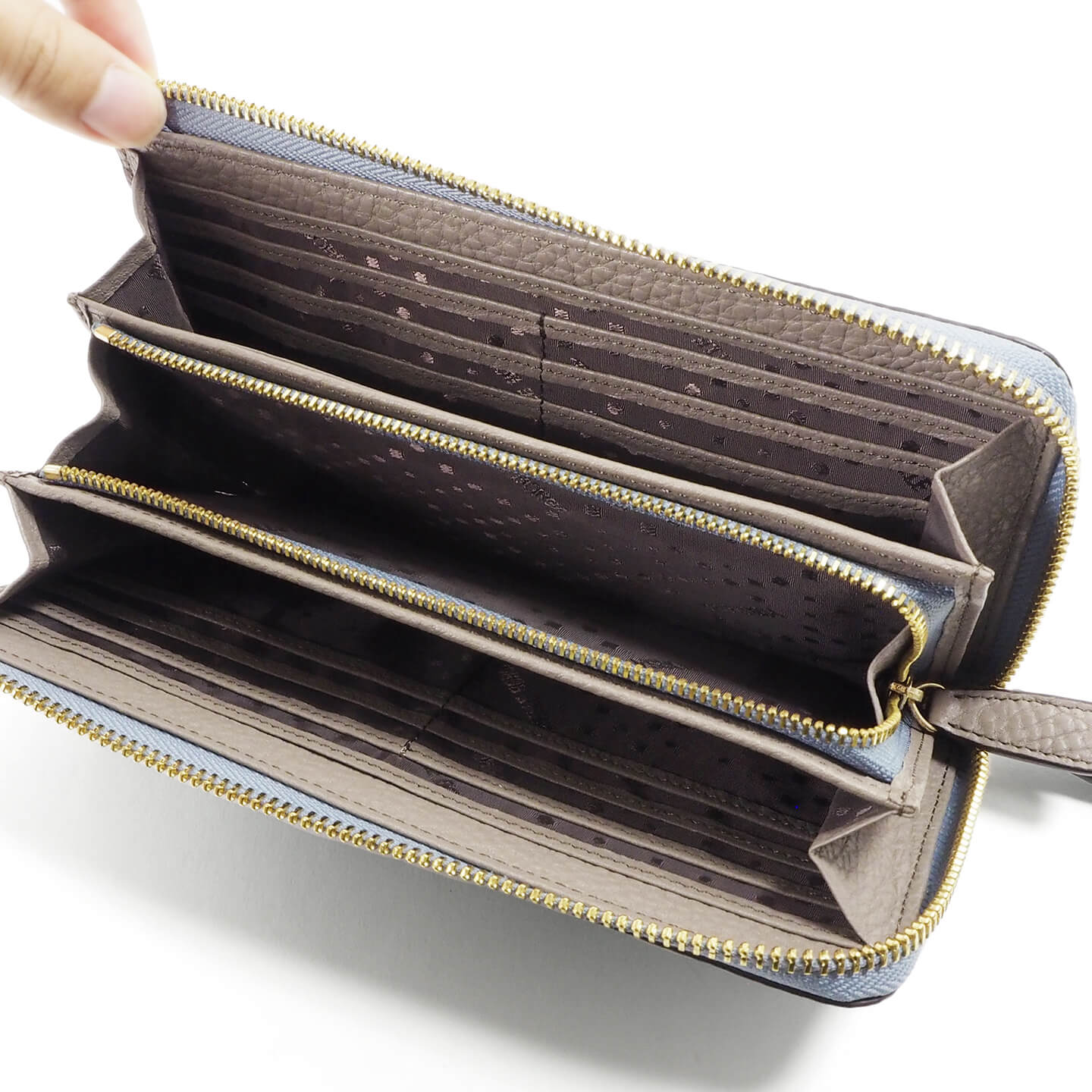 L字ファスナーなのに、ラウンドファスナーと同等のカードポケットや小銭入れを備えた、機能満載のお財布。また、大きく開いて中身を取り出しやすい設計で、使い勝手が抜群です。たくさんのカードスロットや小銭を全部まとめて持てるお財布が欲しい方にピッタリのお財布です。