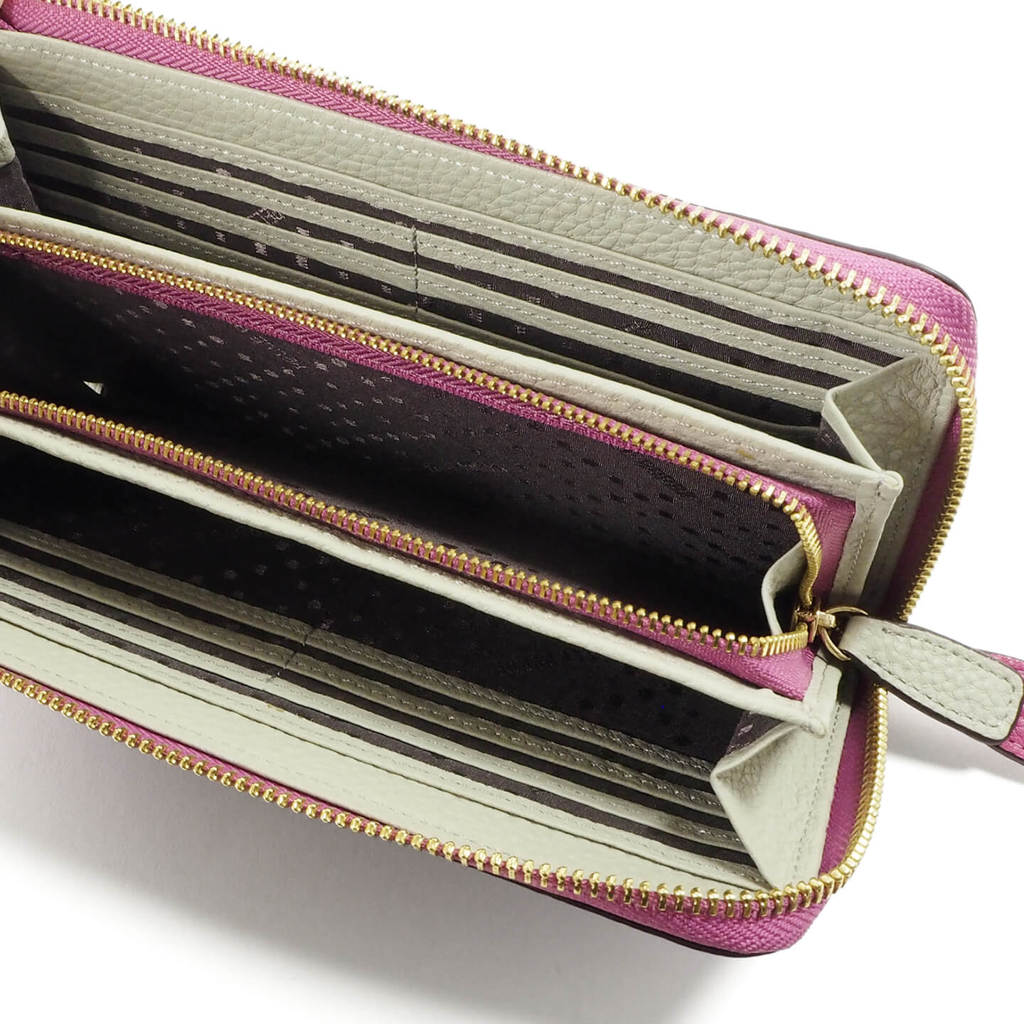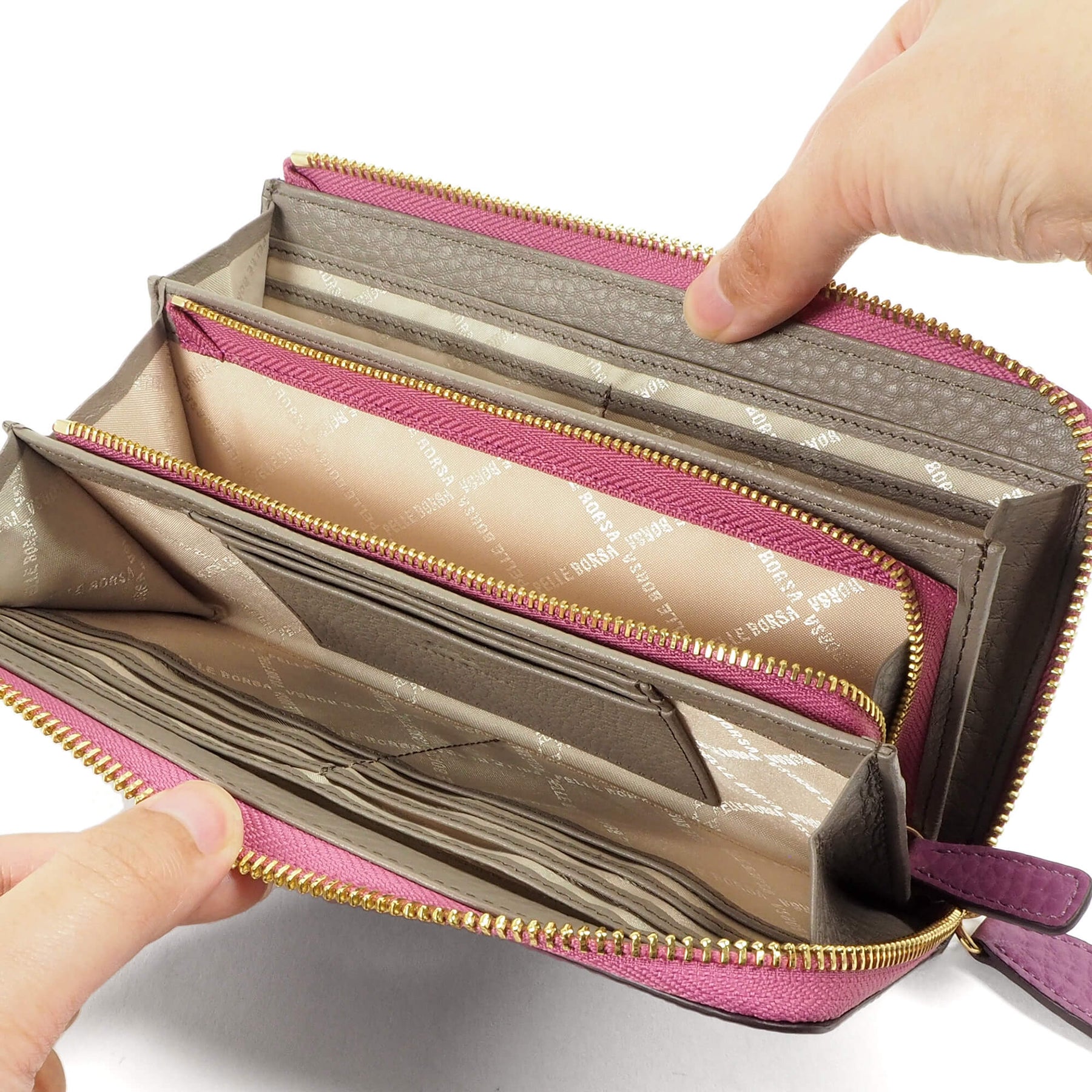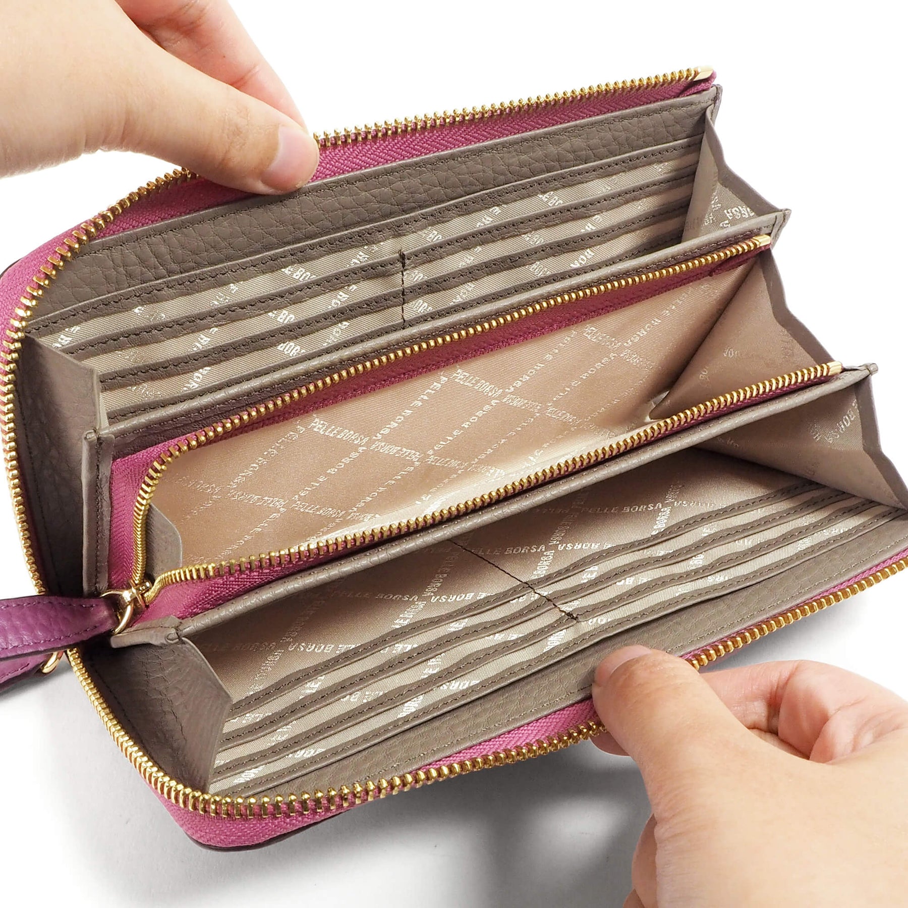 L字ファスナーなのに、ラウンドファスナーと同等のカードポケットや小銭入れを備えた、機能満載のお財布。また、大きく開いて中身を取り出しやすい設計で、使い勝手が抜群です。たくさんのカードスロットや小銭を全部まとめて持てるお財布が欲しい方にピッタリのお財布です。